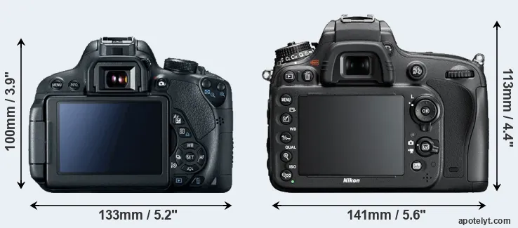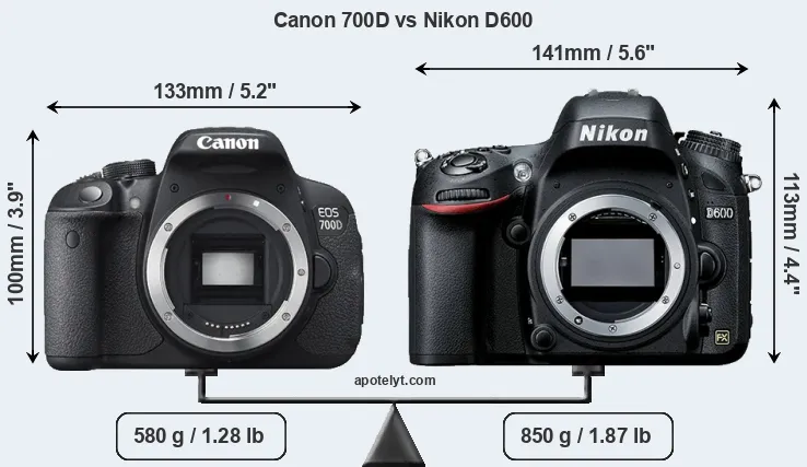 The side-by-side display below illustrates the physical size and weight of the Canon 700D and the Nikon D600. The two cameras are presented according to their relative size. Three consecutive views from the front, the top, and the rear side are shown. All width, height and depth dimensions are rounded to the nearest millimeter.