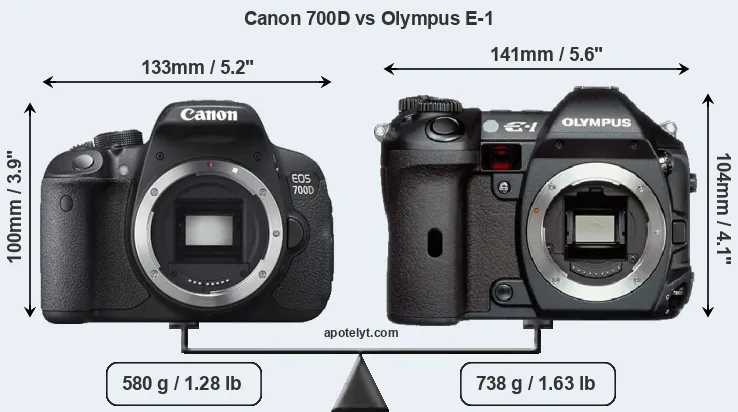 The side-by-side display below illustrates the physical size and weight of the Canon 700D and the Olympus E-1. The two cameras are presented according to their relative size. Three consecutive perspectives from the front, the top, and the back are available. All width, height and depth dimensions are rounded to the nearest millimeter.
