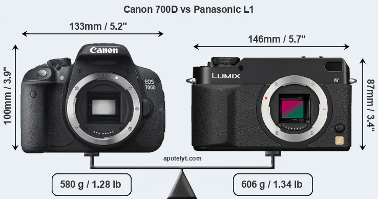 If the front view area (width x height) of the cameras is taken as an aggregate measure of their size, the Panasonic L1 is somewhat smaller (4 percent) than the Canon 700D. However, the L1 is slightly heavier (4 percent) than the 700D. In this context, it is worth noting that neither the 700D nor the L1 are weather-sealed.