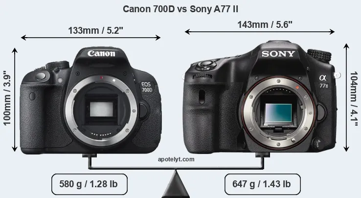 If the front view area (width x height) of the cameras is taken as an aggregate measure of their size, the Sony A77 II is notably larger (12 percent) than the Canon 700D. Moreover, the A77 II is markedly heavier (12 percent) than the 700D. It is noteworthy in this context that the A77 II is splash and dust-proof, while the 700D does not feature any corresponding weather-sealing.