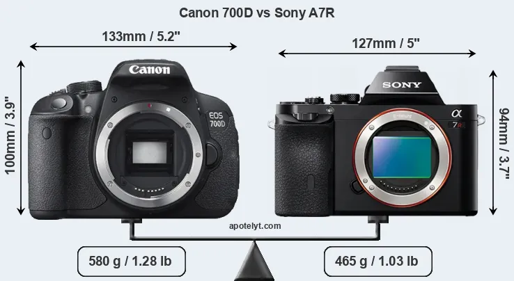An illustration of the physical size and weight of the Canon 700D and the Sony A7R is provided in the side-by-side display below. The two cameras are presented according to their relative size. Three consecutive views from the front, the top, and the rear side are shown. All width, height and depth measures are rounded to the nearest millimeter.