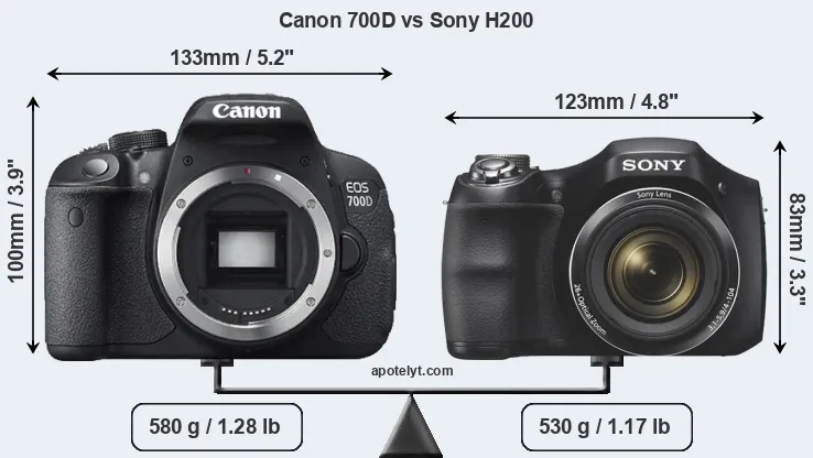 The physical size and weight of the Canon 700D and the Sony H200 are illustrated in the side-by-side display below. The two cameras are presented according to their relative size. Three consecutive perspectives from the front, the top, and the back are available. All width, height and depth dimensions are rounded to the nearest millimeter.