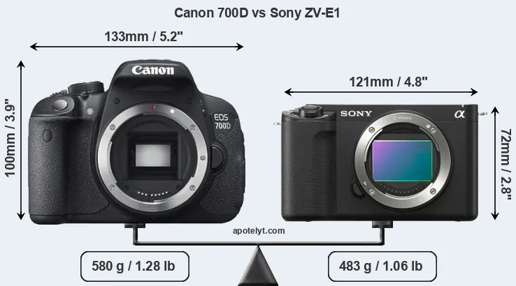 The side-by-side display below illustrates the physical size and weight of the Canon 700D and the Sony ZV-E1. The two cameras are presented according to their relative size. Three consecutive perspectives from the front, the top, and the back are available. All width, height and depth dimensions are rounded to the nearest millimeter.