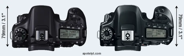 The physical size and weight of the Canon 70D and the Canon 80D are illustrated in the side-by-side display below. The two cameras are presented according to their relative size. Three consecutive views from the front, the top, and the rear side are shown. All width, height and depth dimensions are rounded to the nearest millimeter.