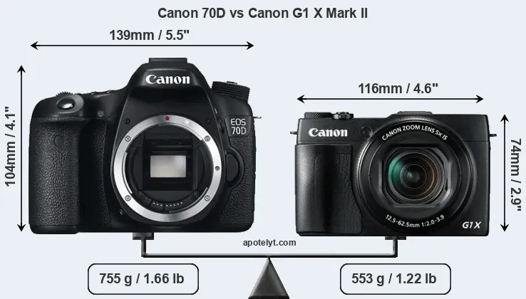 If the front view area (width x height) of the cameras is taken as an aggregate measure of their size, the Canon G1 X Mark II is considerably smaller (41 percent) than the Canon 70D. It is worth mentioning in this context that the 70D is splash and dust resistant, while the G1X Mark II does not feature any corresponding weather-sealing.