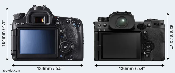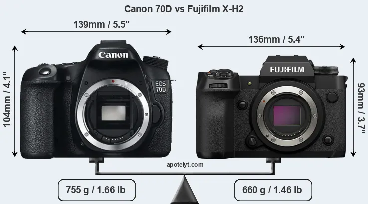 The above size and weight comparisons are to some extent incomplete since they do not consider the interchangeable lenses that both of these cameras require. Both cameras have similarly sized sensors, but DSLRs have a larger flange-to-focal plane distance than mirrorless cameras, which imposes contraints on the optical engineering process and generally leads to bigger and heavier lenses. You can compare the optics available for the two cameras in the Canon EF Lens Catalog (70D) and the Fujinon X Lens Catalog (X-H2). Mirrorless cameras, such as the X-H2, have moreover the advantage that they can use many lenses from other systems via adapters, as they have a relatively short flange to focal plane distance.