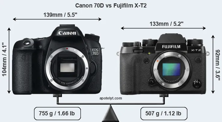 The above size and weight comparisons are to some extent incomplete since they do not consider the interchangeable lenses that both of these cameras require. Both cameras have similarly sized sensors, but DSLRs have a larger flange-to-focal plane distance than mirrorless cameras, which imposes contraints on the optical engineering process and generally leads to bigger and heavier lenses. You can compare the optics available for the two cameras in the Canon EF Lens Catalog (70D) and the Fujinon X Lens Catalog (X-T2). Mirrorless cameras, such as the X-T2, have moreover the advantage that they can use many lenses from other systems via adapters, as they have a relatively short flange to focal plane distance.