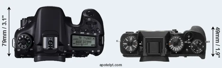The side-by-side display below illustrates the physical size and weight of the Canon 70D and the Fujifilm X-T2. The two cameras are presented according to their relative size. Three consecutive views from the front, the top, and the rear side are shown. All width, height and depth dimensions are rounded to the nearest millimeter.
