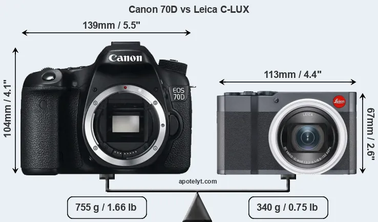 If the front view area (width x height) of the cameras is taken as an aggregate measure of their size, the Leica C-LUX is considerably smaller (48 percent) than the Canon 70D. It is worth mentioning in this context that the 70D is splash and dust resistant, while the C-LUX does not feature any corresponding weather-sealing.