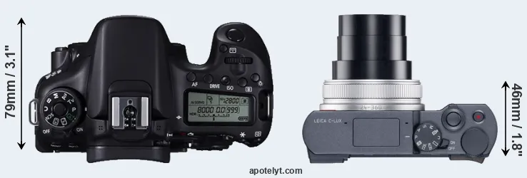 An illustration of the physical size and weight of the Canon 70D and the Leica C-LUX is provided in the side-by-side display below. The two cameras are presented according to their relative size. Three successive views from the front, the top, and the rear are shown. All width, height and depth dimensions are rounded to the nearest millimeter.