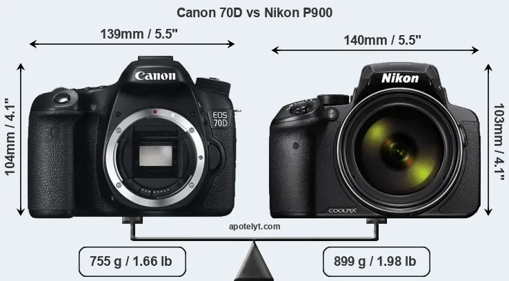 If the front view area (width x height) of the cameras is taken as an aggregate measure of their size, the Canon 70D and the Nikon P900 are of equal size. It is worth mentioning in this context that the 70D is splash and dust resistant, while the P900 does not feature any corresponding weather-sealing.