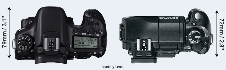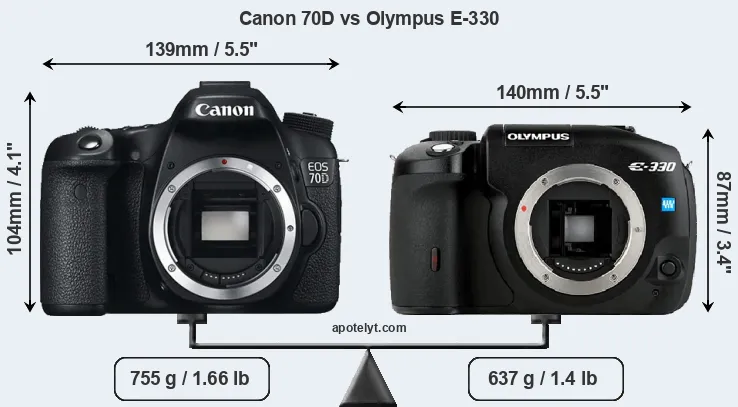 The physical size and weight of the Canon 70D and the Olympus E-330 are illustrated in the side-by-side display below. The two cameras are presented according to their relative size. Three consecutive perspectives from the front, the top, and the back are available. All width, height and depth dimensions are rounded to the nearest millimeter.