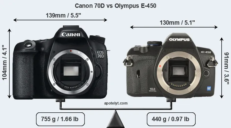 The physical size and weight of the Canon 70D and the Olympus E-450 are illustrated in the side-by-side display below. The two cameras are presented according to their relative size. Three consecutive views from the front, the top, and the rear side are shown. All width, height and depth dimensions are rounded to the nearest millimeter.