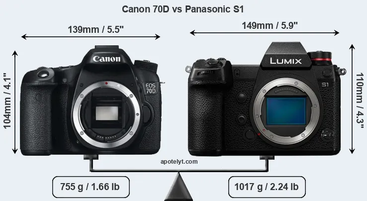 The side-by-side display below illustrates the physical size and weight of the Canon 70D and the Panasonic S1. The two cameras are presented according to their relative size. Three consecutive perspectives from the front, the top, and the back are available. All width, height and depth measures are rounded to the nearest millimeter.