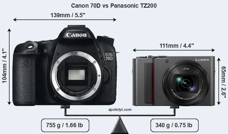The physical size and weight of the Canon 70D and the Panasonic TZ200 are illustrated in the side-by-side display below. The two cameras are presented according to their relative size. Three consecutive perspectives from the front, the top, and the back are available. All width, height and depth measures are rounded to the nearest millimeter.