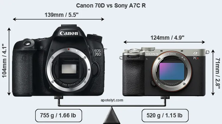 Going beyond this snapshot of core features and characteristics, what are the differences between the Canon EOS 70D and the Sony Alpha A7C R? Which one should you buy? Read on to find out how these two cameras compare with respect to their body size, their imaging sensors, their shooting features, their input-output connections, and their reception by expert reviewers.