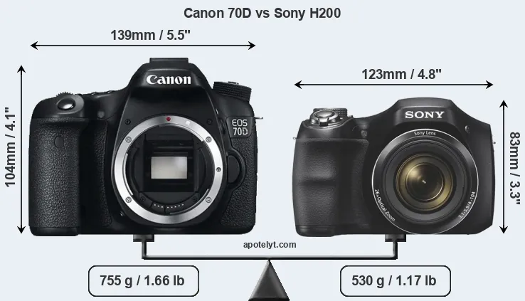 An illustration of the physical size and weight of the Canon 70D and the Sony H200 is provided in the side-by-side display below. The two cameras are presented according to their relative size. Three consecutive views from the front, the top, and the rear side are shown. All width, height and depth measures are rounded to the nearest millimeter.