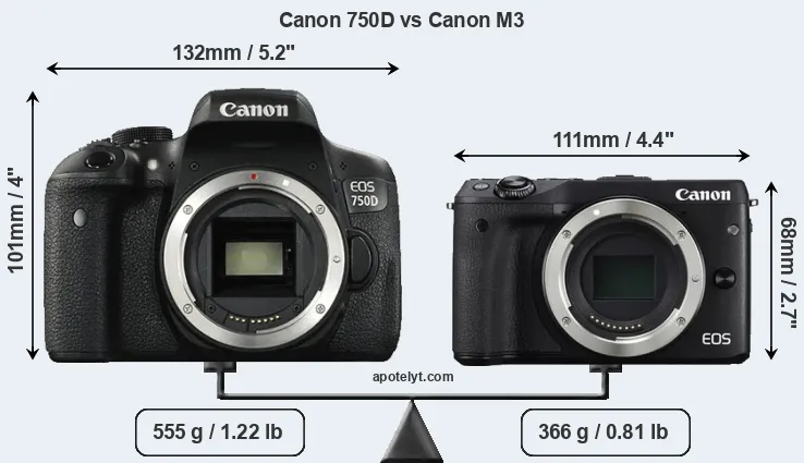 The side-by-side display below illustrates the physical size and weight of the Canon 750D and the Canon M3. The two cameras are presented according to their relative size. Three successive views from the front, the top, and the rear are shown. All width, height and depth dimensions are rounded to the nearest millimeter.