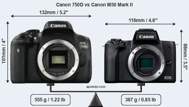 The side-by-side display below illustrates the physical size and weight of the Canon 750D and the Canon M50 Mark II. The two cameras are presented according to their relative size. Three consecutive perspectives from the front, the top, and the back are available. All width, height and depth dimensions are rounded to the nearest millimeter.