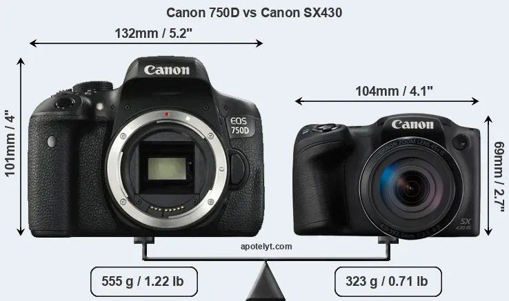 The above size and weight comparisons are to some extent incomplete and possibly misleading, as the SX430 has a lens built in, whereas the 750D is an interchangeable lens camera that requires a separate lens. Attaching the latter will add extra weight and bulk to the setup. You can compare the optics available for the 750D and their specifications in the Canon EF Lens Catalog.