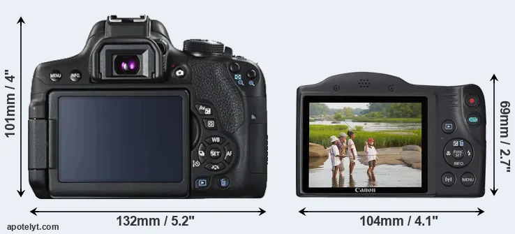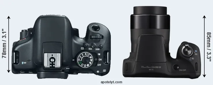 The side-by-side display below illustrates the physical size and weight of the Canon 750D and the Canon SX430. The two cameras are presented according to their relative size. Three consecutive views from the front, the top, and the rear side are shown. All size dimensions are rounded to the nearest millimeter.