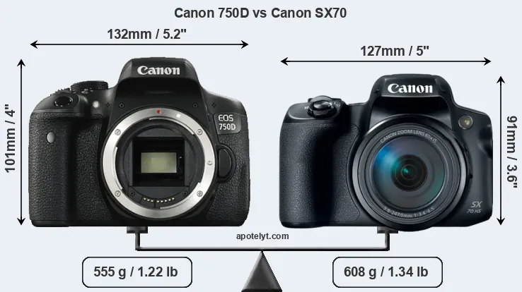An illustration of the physical size and weight of the Canon 750D and the Canon SX70 is provided in the side-by-side display below. The two cameras are presented according to their relative size. Three consecutive perspectives from the front, the top, and the back are available. All width, height and depth measures are rounded to the nearest millimeter.