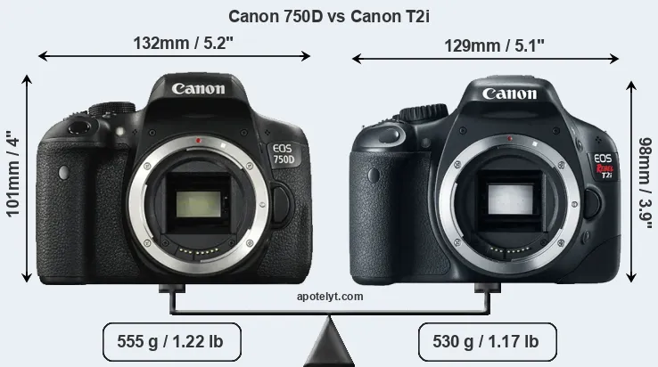 An illustration of the physical size and weight of the Canon 750D and the Canon T2i is provided in the side-by-side display below. The two cameras are presented according to their relative size. Three successive views from the front, the top, and the rear are shown. All width, height and depth dimensions are rounded to the nearest millimeter.