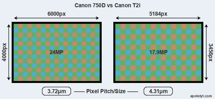 While the two cameras under review share the same sensor size, the 750D offers a higher resolution of 24 megapixels, compared with 17.9 MP of the T2i. This megapixels advantage translates into a 16 percent gain in linear resolution. On the other hand, these sensor specs imply that the 750D has a higher pixel density and a smaller size of the individual pixel (with a pixel pitch of 3.72μm versus 4.31μm for the T2i). In this context, it should be noted, however, that the 750D is much more recent (by 4 years and 11 months) than the T2i, and its sensor will have benefitted from technological advances during this time that compensate for the smaller pixel size.