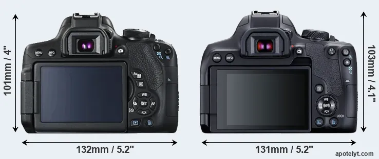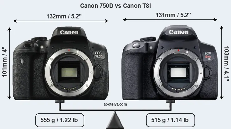 The side-by-side display below illustrates the physical size and weight of the Canon 750D and the Canon T8i. The two cameras are presented according to their relative size. Three consecutive perspectives from the front, the top, and the back are available. All size dimensions are rounded to the nearest millimeter.