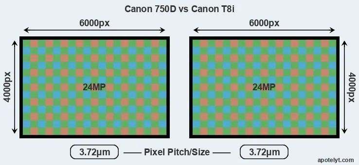 The two cameras under review do not only share the same sensor size, but also offer an identical resolution of 24 megapixels. This similarity in sensor specs implies that both the 750D and the T8i have the same pixel density, as well as the same pixel size. It should, however, be noted that the T8i is much more recent (by 5 years) than the 750D, and its sensor will have benefitted from technological advances during this time.