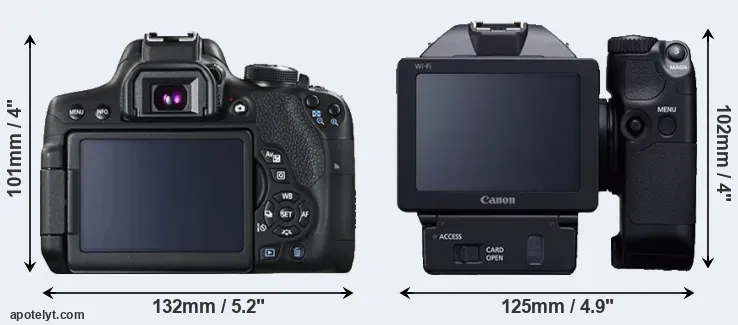 The side-by-side display below illustrates the physical size and weight of the Canon 750D and the Canon XC10. The two cameras are presented according to their relative size. Three successive views from the front, the top, and the rear are shown. All size dimensions are rounded to the nearest millimeter.