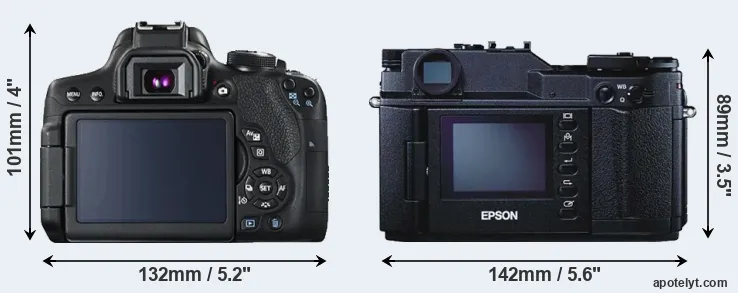 The physical size and weight of the Canon 750D and the Epson R-D1 are illustrated in the side-by-side display below. The two cameras are presented according to their relative size. Three consecutive perspectives from the front, the top, and the back are available. All width, height and depth dimensions are rounded to the nearest millimeter.