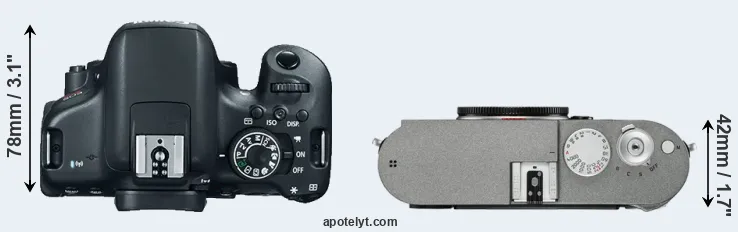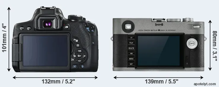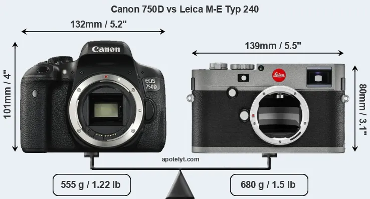 The side-by-side display below illustrates the physical size and weight of the Canon 750D and the Leica M-E Typ 240. The two cameras are presented according to their relative size. Three consecutive perspectives from the front, the top, and the back are available. All width, height and depth measures are rounded to the nearest millimeter.
