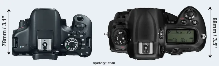 The side-by-side display below illustrates the physical size and weight of the Canon 750D and the Nikon D3. The two cameras are presented according to their relative size. Three successive views from the front, the top, and the rear are shown. All width, height and depth dimensions are rounded to the nearest millimeter.