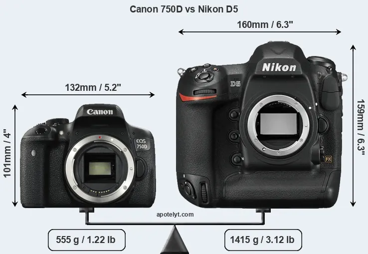 If the front view area (width x height) of the cameras is taken as an aggregate measure of their size, the Nikon D5 is considerably larger (91 percent) than the Canon 750D. Moreover, the D5 is substantially heavier (155 percent) than the 750D. It is noteworthy in this context that the D5 is splash and dust-proof, while the 750D does not feature any corresponding weather-sealing.