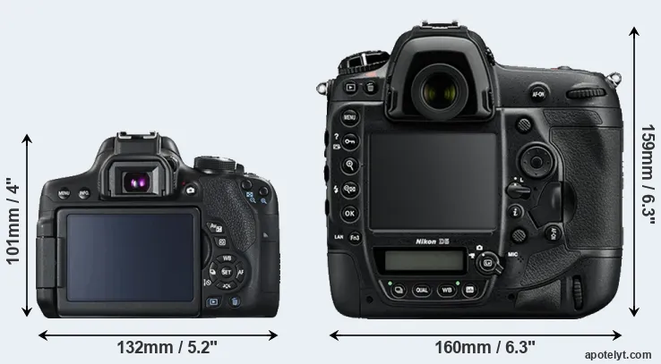 Going beyond this snapshot of core features and characteristics, what are the differences between the Canon EOS 750D and the Nikon D5? Which one should you buy? Read on to find out how these two cameras compare with respect to their body size, their imaging sensors, their shooting features, their input-output connections, and their reception by expert reviewers.