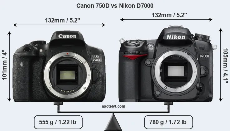 An illustration of the physical size and weight of the Canon 750D and the Nikon D7000 is provided in the side-by-side display below. The two cameras are presented according to their relative size. Three consecutive perspectives from the front, the top, and the back are available. All size dimensions are rounded to the nearest millimeter.