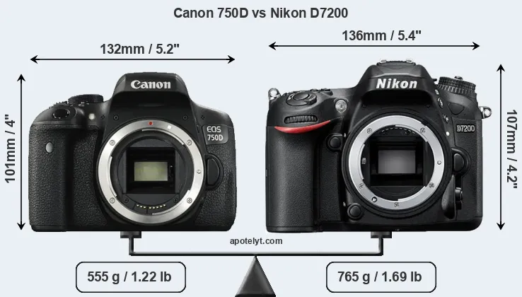 If the front view area (width x height) of the cameras is taken as an aggregate measure of their size, the Nikon D7200 is notably larger (9 percent) than the Canon 750D. Moreover, the D7200 is substantially heavier (38 percent) than the 750D. It is noteworthy in this context that the D7200 is splash and dust-proof, while the 750D does not feature any corresponding weather-sealing.