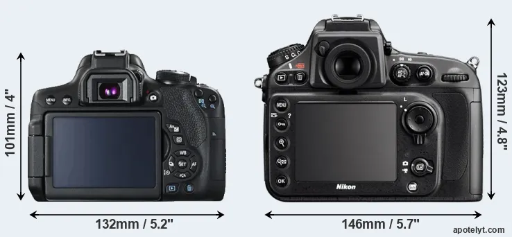 Going beyond this snapshot of core features and characteristics, what are the differences between the Canon EOS 750D and the Nikon D800? Which one should you buy? Read on to find out how these two cameras compare with respect to their body size, their imaging sensors, their shooting features, their input-output connections, and their reception by expert reviewers.