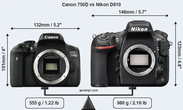 The side-by-side display below illustrates the physical size and weight of the Canon 750D and the Nikon D810. The two cameras are presented according to their relative size. Three consecutive views from the front, the top, and the rear side are shown. All width, height and depth dimensions are rounded to the nearest millimeter.