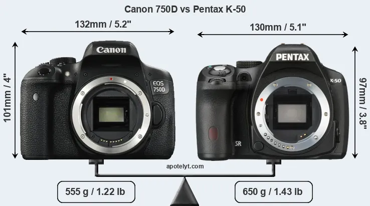 The physical size and weight of the Canon 750D and the Pentax K-50 are illustrated in the side-by-side display below. The two cameras are presented according to their relative size. Three consecutive perspectives from the front, the top, and the back are available. All width, height and depth dimensions are rounded to the nearest millimeter.