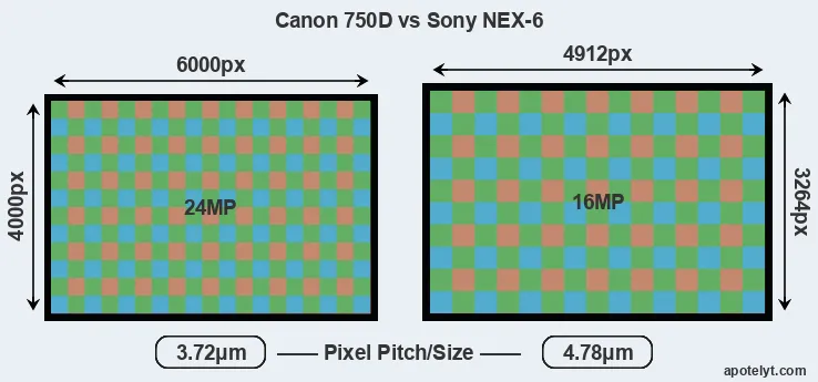 Despite having a smaller sensor, the Canon 750D offers a higher resolution of 24 megapixels, compared with 16 MP of the Sony NEX-6. This megapixels advantage comes at the cost of a higher pixel density and a smaller size of the individual pixel (with a pixel pitch of 3.72μm versus 4.78μm for the NEX-6). However, it should be noted that the 750D is much more recent (by 2 years and 4 months) than the NEX-6, and its sensor will have benefitted from technological advances during this time that make it possible to gather light more efficiently.