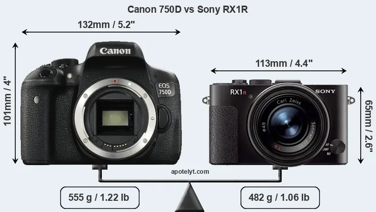 The side-by-side display below illustrates the physical size and weight of the Canon 750D and the Sony RX1R. The two cameras are presented according to their relative size. Three consecutive perspectives from the front, the top, and the back are available. All size dimensions are rounded to the nearest millimeter.