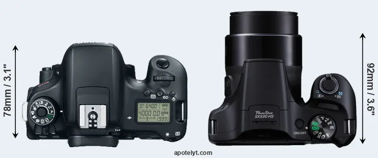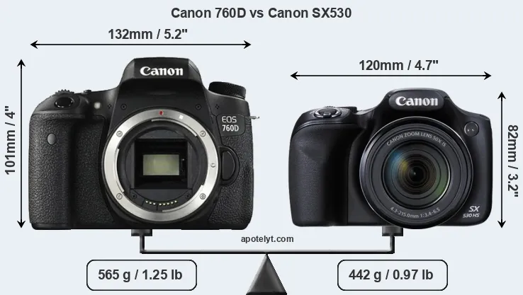 An illustration of the physical size and weight of the Canon 760D and the Canon SX530 is provided in the side-by-side display below. The two cameras are presented according to their relative size. Three consecutive views from the front, the top, and the rear side are shown. All width, height and depth measures are rounded to the nearest millimeter.