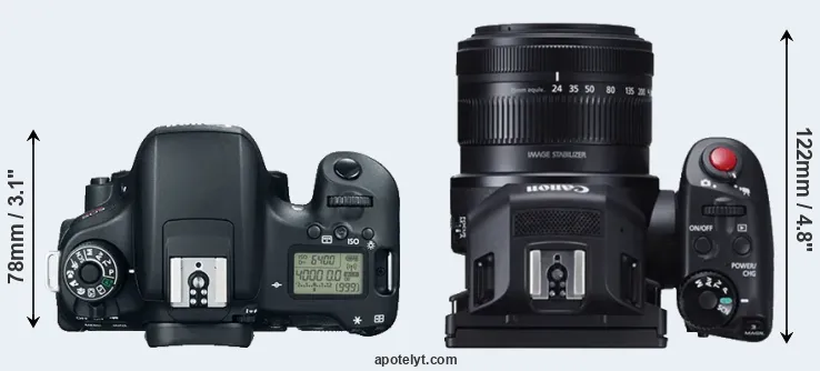The side-by-side display below illustrates the physical size and weight of the Canon 760D and the Canon XC10. The two cameras are presented according to their relative size. Three successive views from the front, the top, and the rear are shown. All size dimensions are rounded to the nearest millimeter.