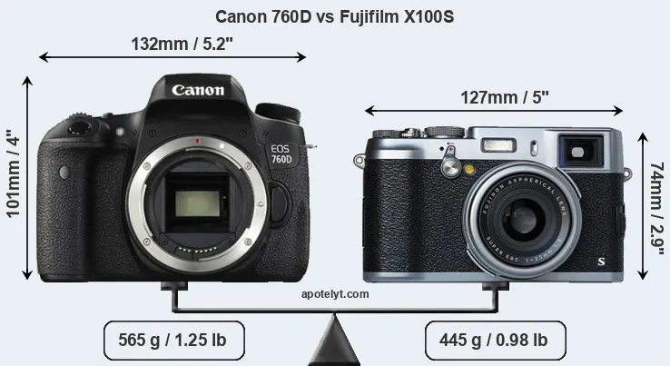 An illustration of the physical size and weight of the Canon 760D and the Fujifilm X100S is provided in the side-by-side display below. The two cameras are presented according to their relative size. Three consecutive perspectives from the front, the top, and the back are available. All size dimensions are rounded to the nearest millimeter.