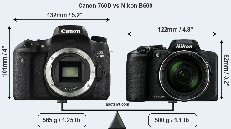 An illustration of the physical size and weight of the Canon 760D and the Nikon B600 is provided in the side-by-side display below. The two cameras are presented according to their relative size. Three consecutive views from the front, the top, and the rear side are shown. All width, height and depth measures are rounded to the nearest millimeter.