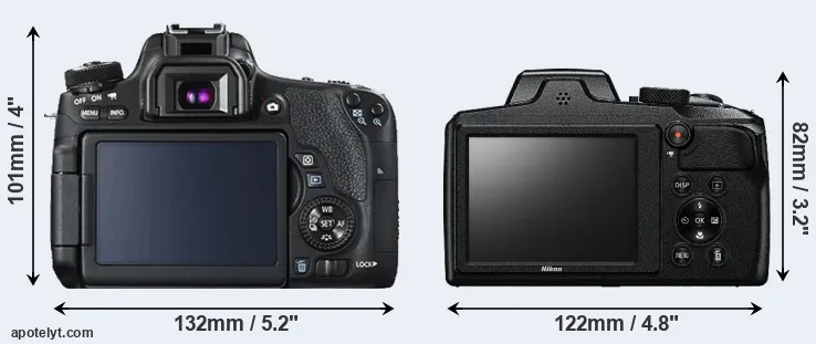 Going beyond this snapshot of core features and characteristics, what are the differences between the Canon EOS 760D and the Nikon Coolpix B600? Which one should you buy? Read on to find out how these two cameras compare with respect to their body size, their imaging sensors, their shooting features, their input-output connections, and their reception by expert reviewers.