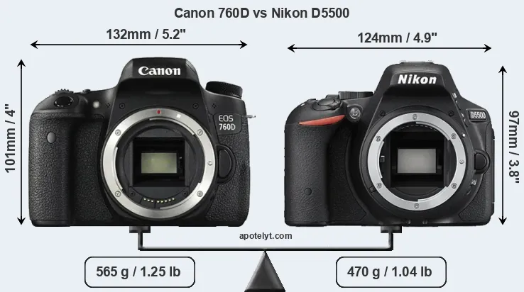 If the front view area (width x height) of the cameras is taken as an aggregate measure of their size, the Nikon D5500 is notably smaller (10 percent) than the Canon 760D. Moreover, the D5500 is markedly lighter (17 percent) than the 760D. In this context, it is worth noting that neither the 760D nor the D5500 are weather-sealed.