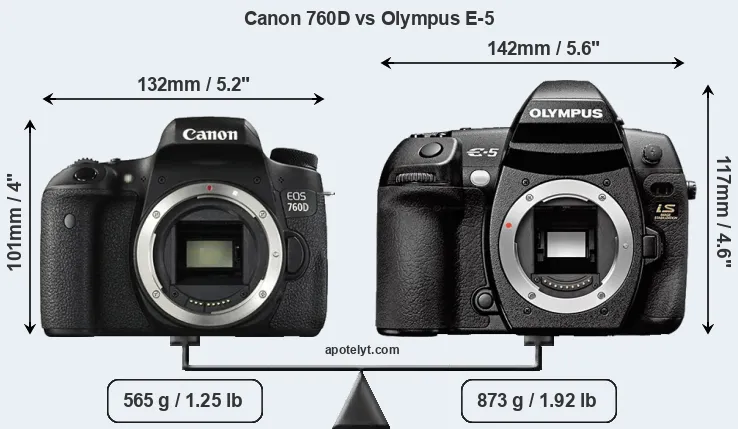 If the front view area (width x height) of the cameras is taken as an aggregate measure of their size, the Olympus E-5 is notably larger (25 percent) than the Canon 760D. Moreover, the E-5 is substantially heavier (55 percent) than the 760D. It is noteworthy in this context that the E-5 is splash and dust-proof, while the 760D does not feature any corresponding weather-sealing.